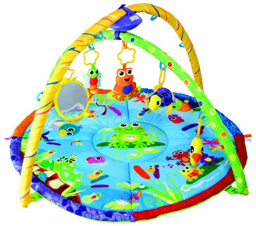Turn your activity gym into a life size mobile This colorful, round playmat features arms that suspend and magically move above baby, bringing the toys to life while promoting visual tracking. The gym offers upbeat music and has adorable animal characters hanging from the arms. Perfect for tummy time play and self-discovery, the gym includes a large sun mirror with shiny ribbons. For easy clean-up, the cushioned mat is machine washable.