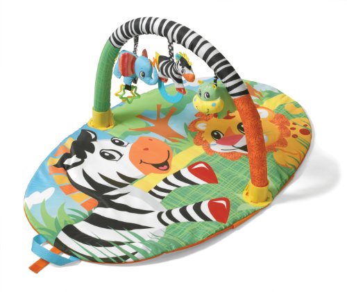 With engaging colors, textures, lights, and sounds galore, the Gymini Move & Play is a multisensory activity gym. All of the toys--including the monkey rattle, sun-and-cloud rattle, jitter elephant, colorful teether, and adjustable mirror--attach to the arches with sliding rings, so you can place them near your baby for easy viewing, batting, and grasping. You can even detach the toys for fun on the go.